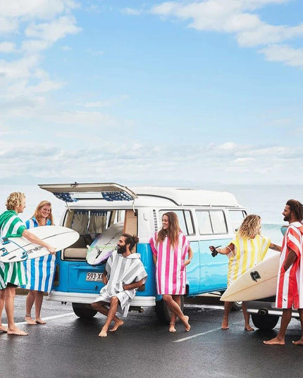 Be seen in stripes with an eye catching solution to getting dry in public places. This quick-dry poncho is perfect for any beach day, providing dryness and warmth between dips, and also makes a perfect cover to change in and out of your swimmers.